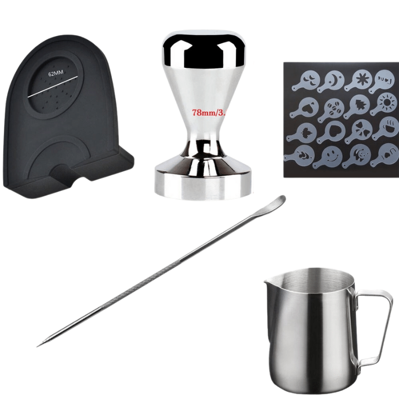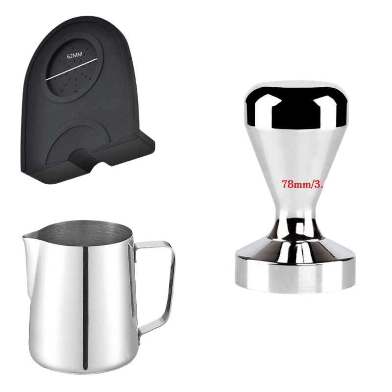 1 x Tamper. 1 x Becherunterlage, 1 x Stoffbeutel.