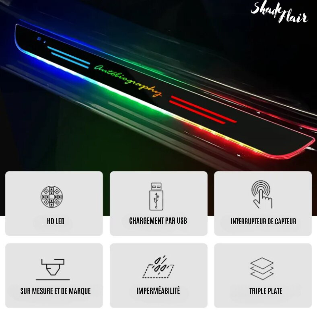 Wenn Sie die Tür öffnen, leuchtet die Einstiegsleiste auf und zeigt den Namen und das Logo des Fahrzeugs an. Sie schalten sich automatisch aus, wenn die Tür geschlossen wird. Verleiht Ihrem Auto einen neuen, eleganten Look.