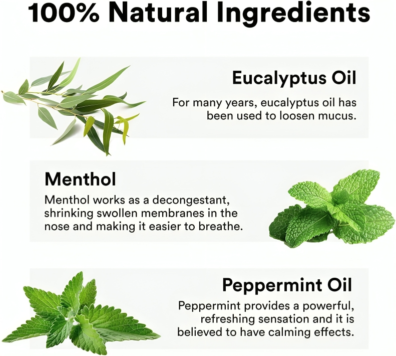 • Inhaltsstoffe:Menthol,Eukalyptusöl,Pfefferminzöl,Speammintöl,Lavendelöl,Zitronenschalenöl,Orangenschalenöl,Wintergrünöl