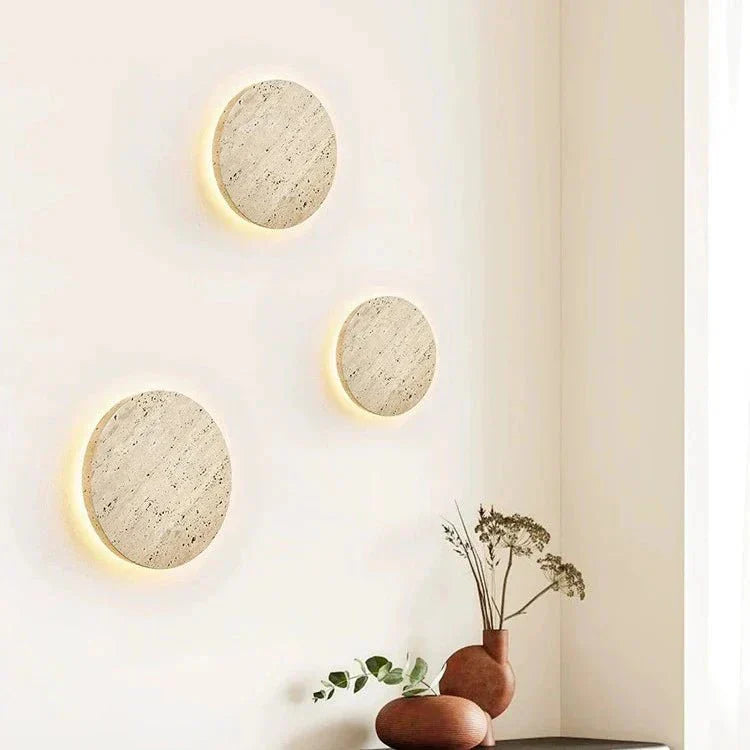 Runde LED Wandleuchte aus Travertin