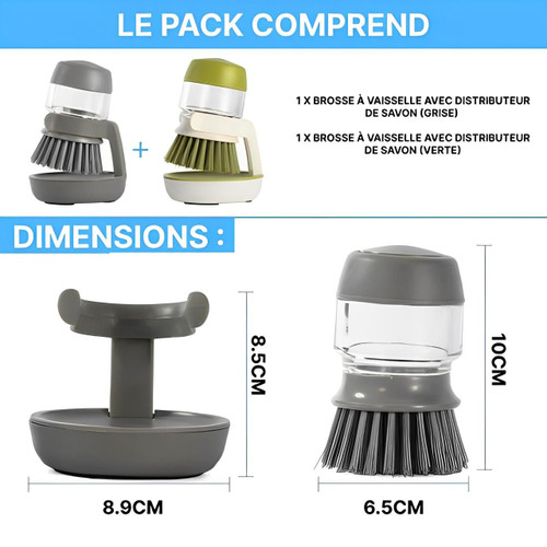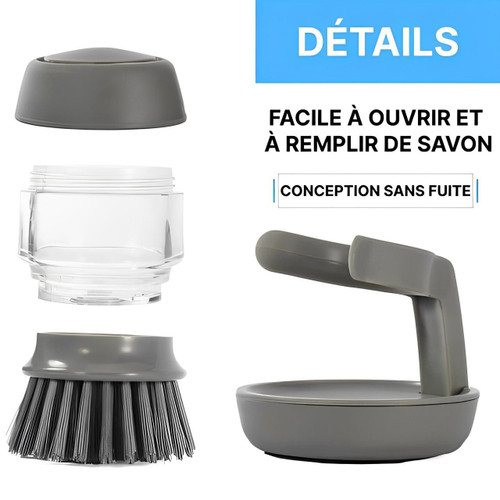 Die Spülbürste mit Reservoir wird mit einem Seifenspender und einem Abtropfständer geliefert. Die Anwendung ist einfach. Füllen Sie einfach den Spender mit der Flüssigkeit Ihrer Wahl und befestigen Sie die Bürste.