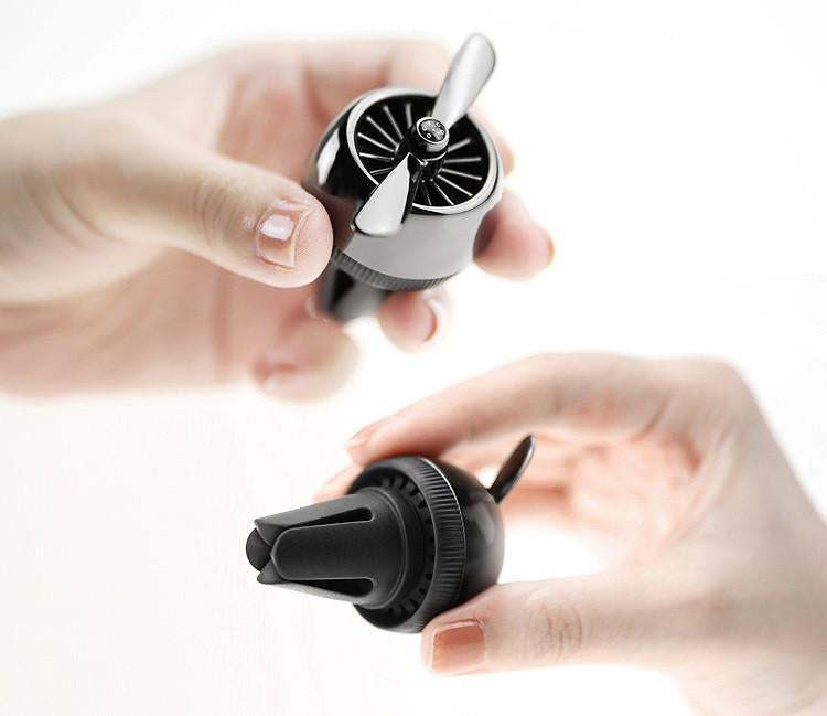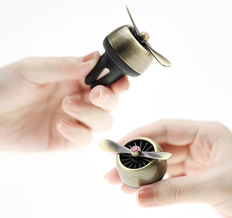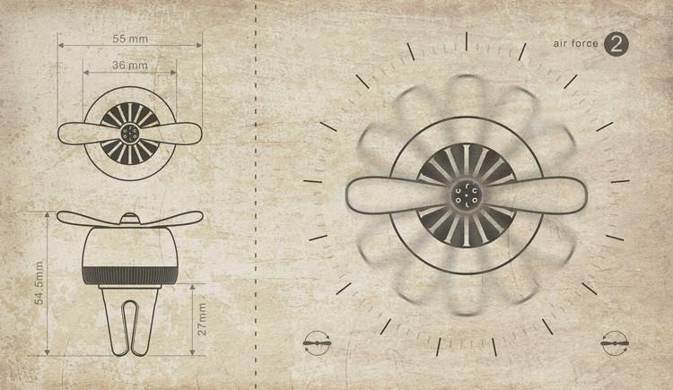 Der Designer hat sich bemüht, die Schnittstelle zwischen Nostalgie und Stil zu erkunden. Er kombiniert einen einzelnen Turbinenmotor und ein Propeller-Design inspiriert von Air Force 2. Jedes Designdetail und jede raffinierte Technik verkörpern den romantischen Geist der Freiheit. Mit diesem Auto-Lufterfrischer würdigt der Designer die großartige Industrie, die psychedelische Musik und die Menschen, die nach Freiheit strebten. Der Designer ist überzeugt, dass ein Wildfang im Inneren eines jeden Menschen wohnt.