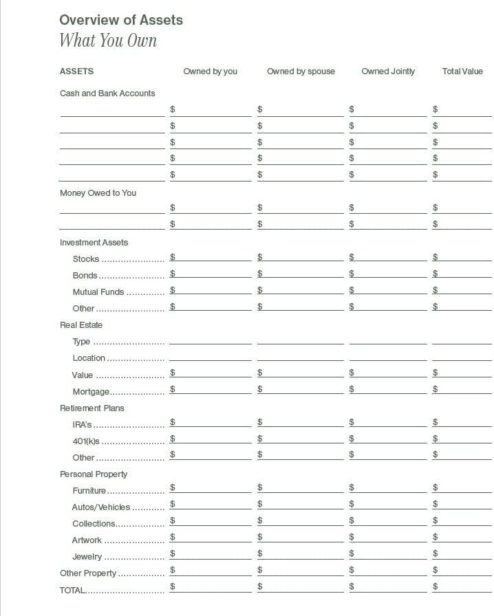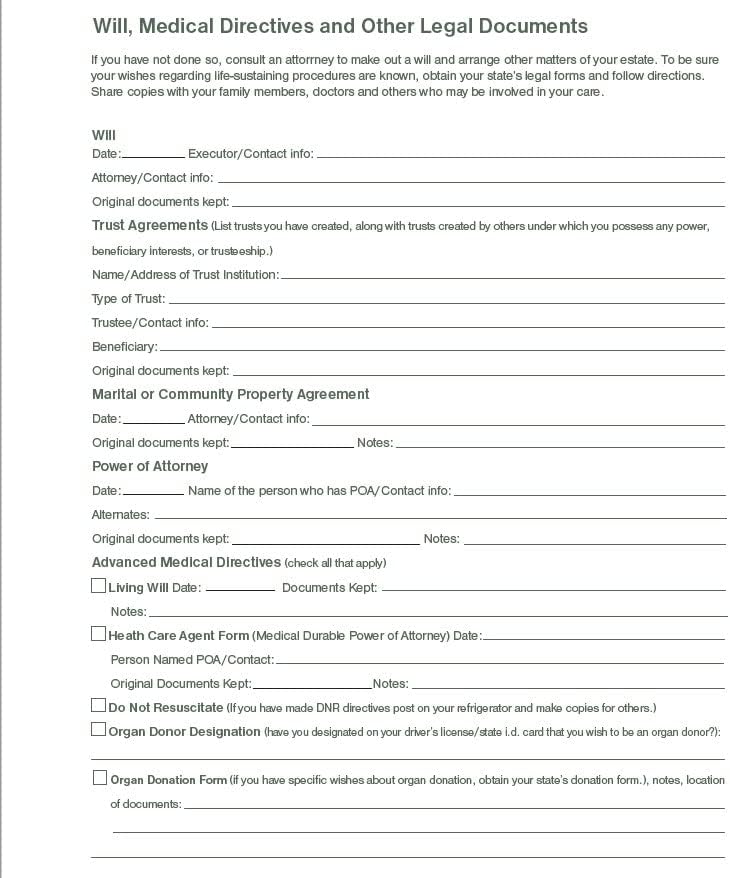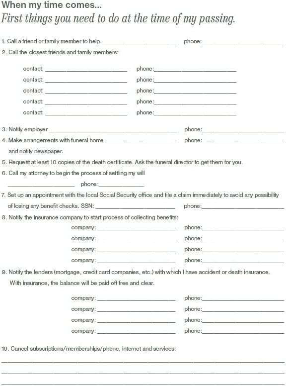 • Notieren Sie, wo wichtige finanzielle und rechtliche Unterlagen aufbewahrt werden, listen Sie Ärzte und wichtige Kontakte auf und leiten Sie sie, was zum Zeitpunkt Ihres Ablebens zu tun ist