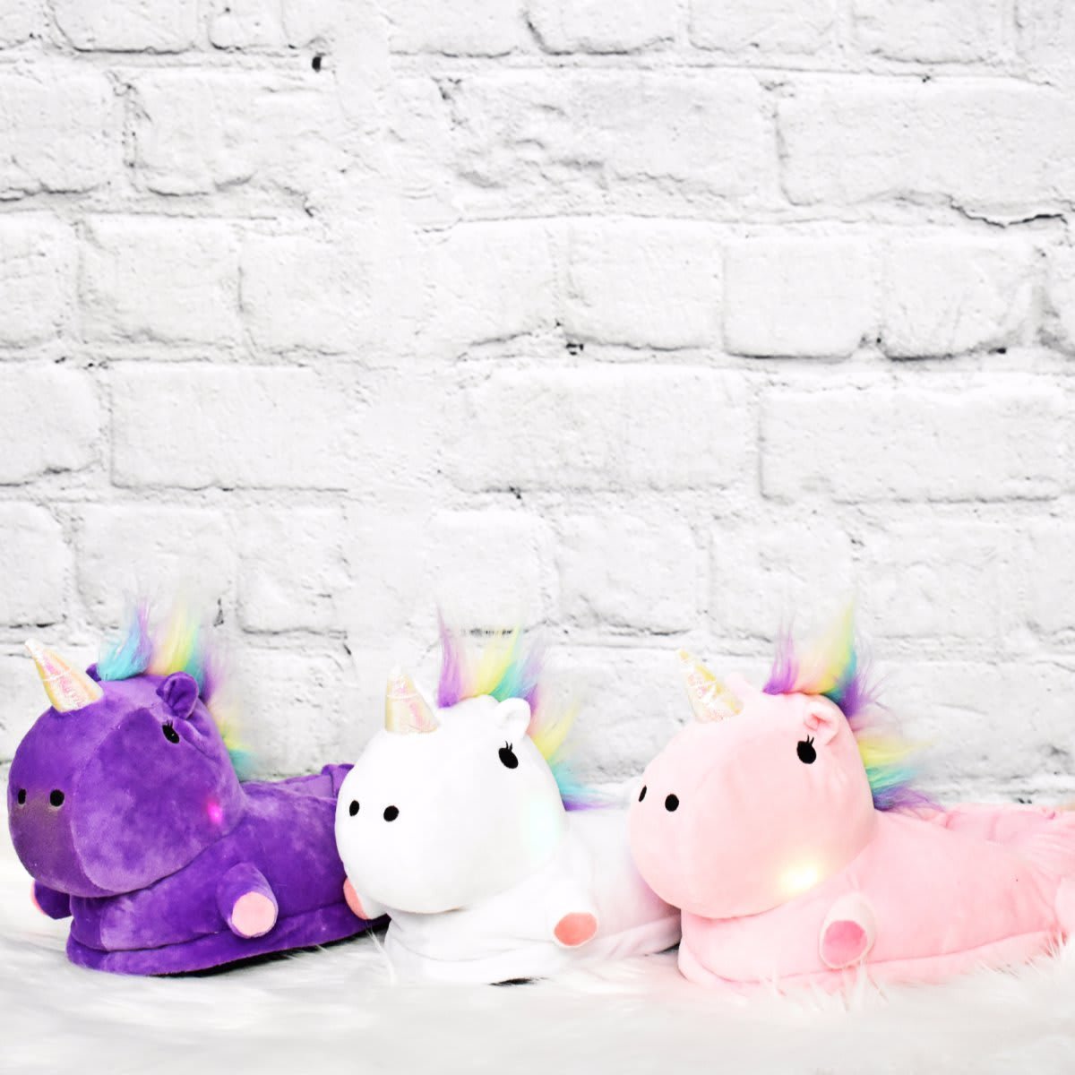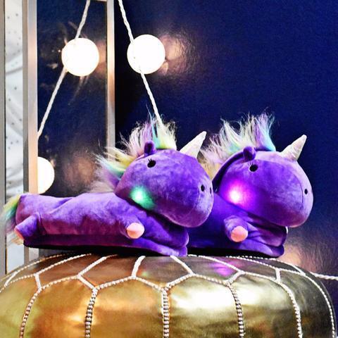 Doch sie sind nicht nur niedlich... diese Hausschuhe leuchten tatsächlich, wenn sie getragen werden! Der Ein/Aus-Schalter ist in dem Schuh verborgen, und wenn er aktiviert ist, strahlen die Wangen des Einhorns in einem Regenbogen von Farben.