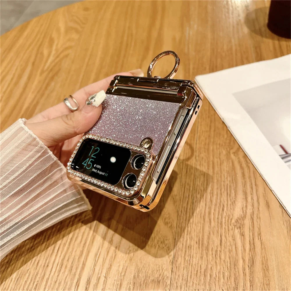Verleihen Sie Ihrem Look einen neuen Schwung mit unserem Gradient Glitter Diamond Samsung Z Flip Ring Holder Case, das Luxus und Funktionalität vereint. Dieses beeindruckende Case bietet ein fesselndes gradient glitter Design, das im Licht funkelt, ergänzt durch einen stilvollen Ringhalter und eine elegante, vergoldete Oberfläche.