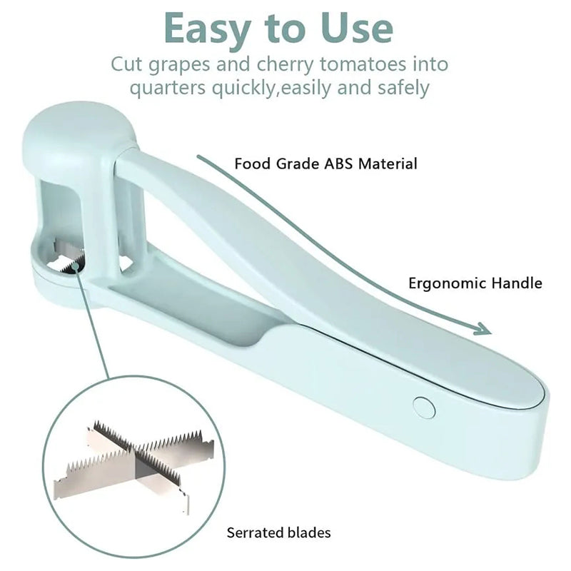 • Einfach zu bedienen: Legen Sie eine kleine Traube in die Kammer des Traubenschneiders. Drücken Sie dann den Stößel, um die Traube schnell und einfach in 4 perfekte Stücke zu schneiden