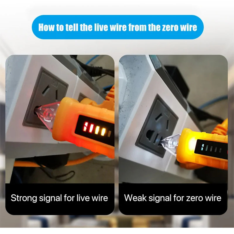 Berührungsloser Spannungsprüfer: Innerhalb von 12-1000V AC können Sie das Live- und Nullkabel problemlos durch unterschiedliche Alarmtöne und LED-Anzeigen unterscheiden.