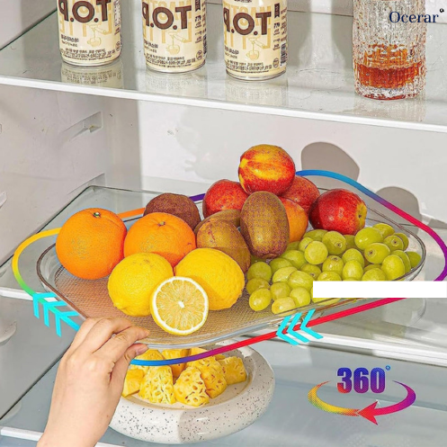 • VIELSEITIGES DESIGN: Diese rechteckige Kühlschrankablage im Karussellstil bietet ein kreatives Design, das Ihnen eine nützliche Lösung zur Aufbewahrung in Ihrem Kühlschrank bietet. Sie nutzt den Platz in der Kühlschrank-Ecke optimal und ermöglicht dank ihrer 360-Grad-Drehfunktion einen einfachen Zugriff auf alle benötigten Artikel.