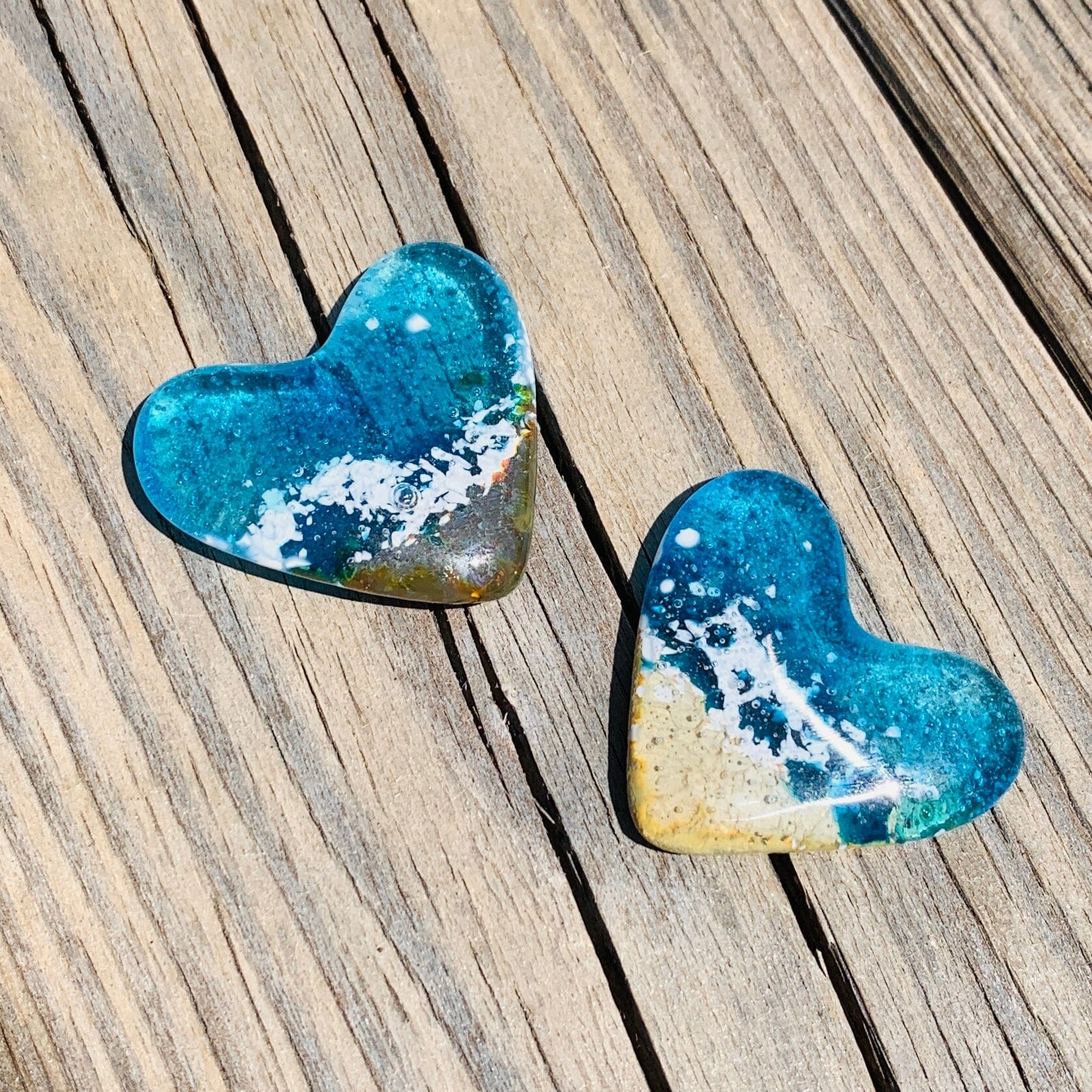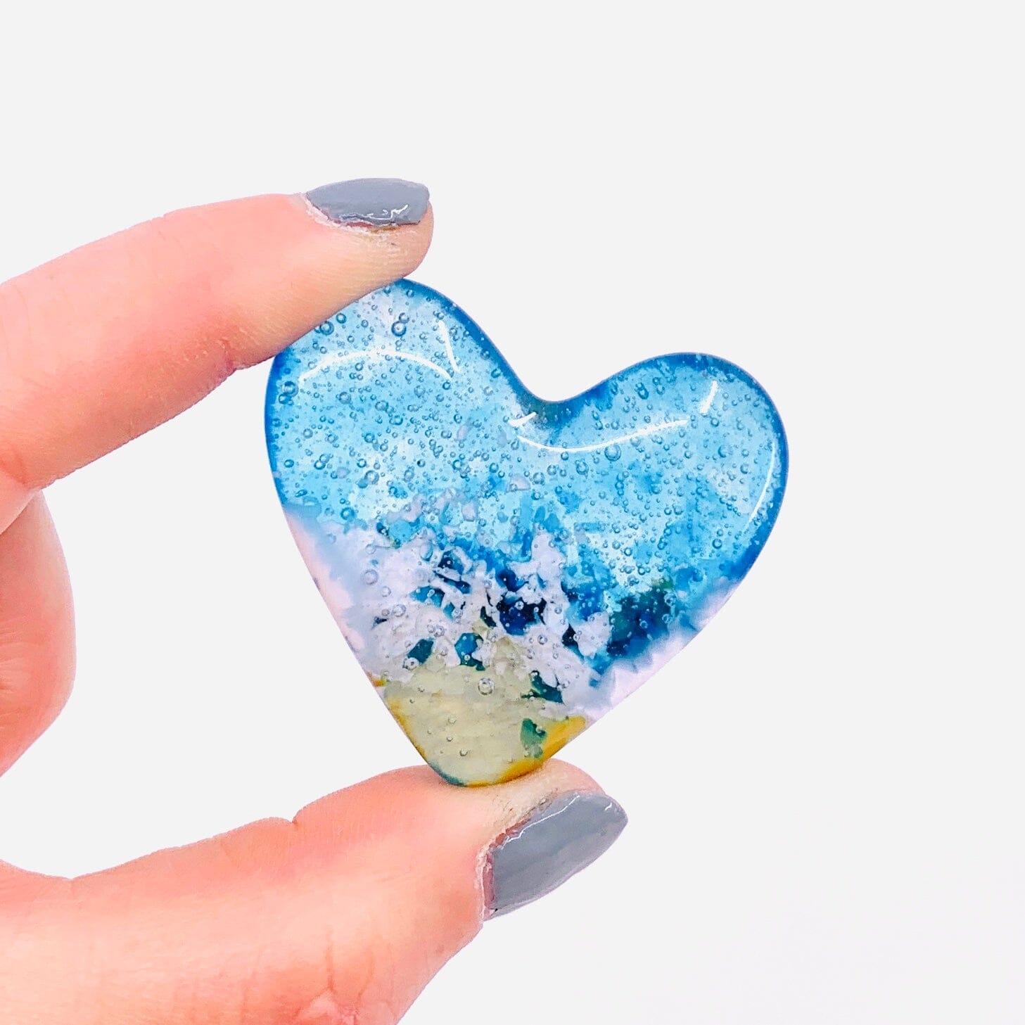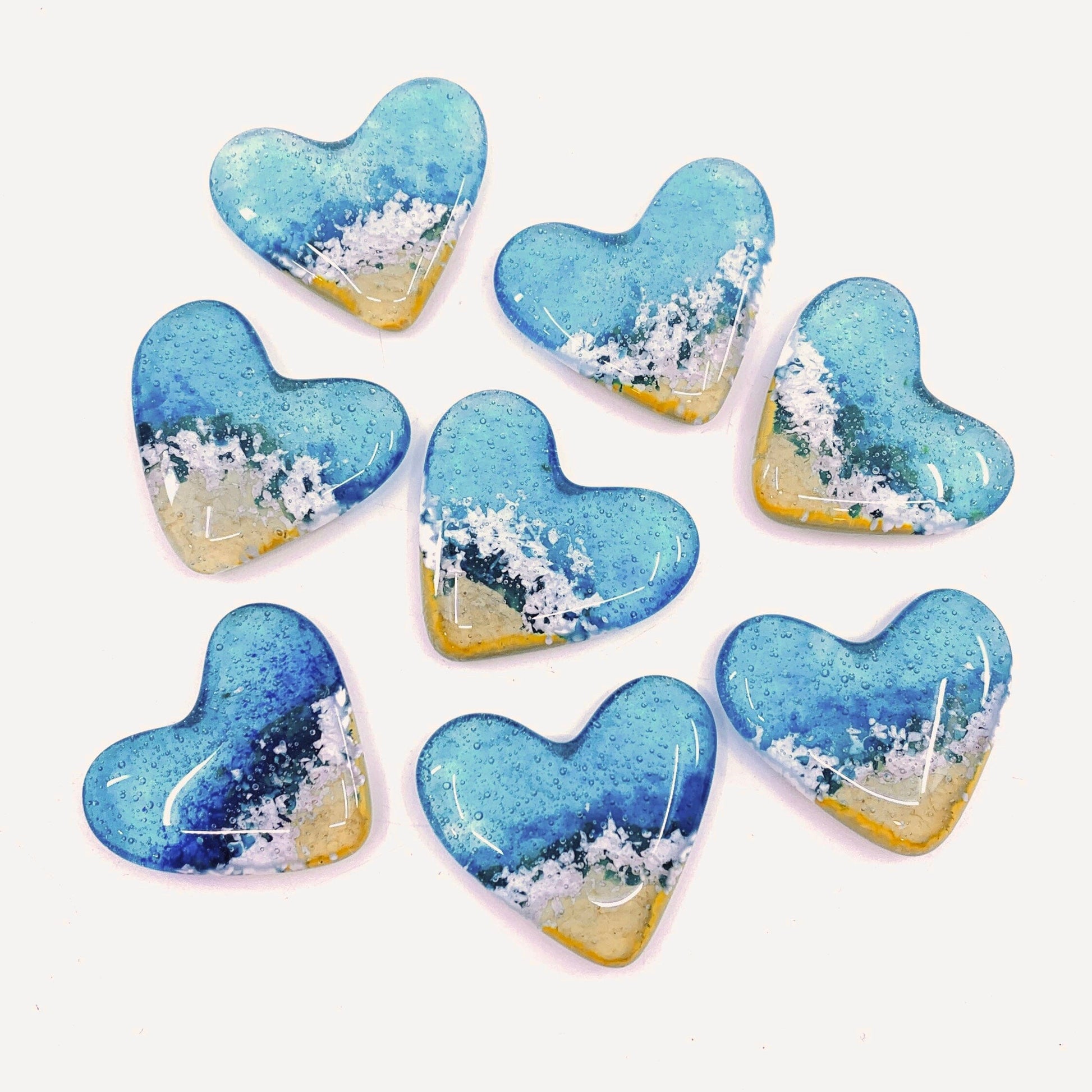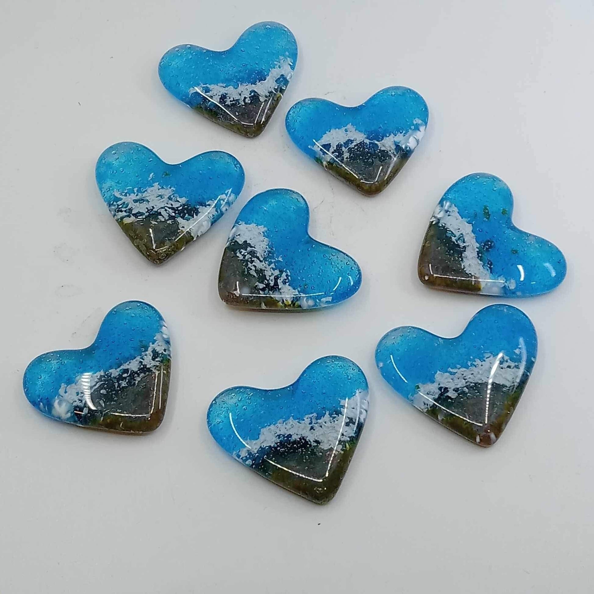 Diese wundervollen Taschenherzen aus geschmolzenem Glas werden aus recyceltem Glasmaterial liebevoll von Hand gefertigt.