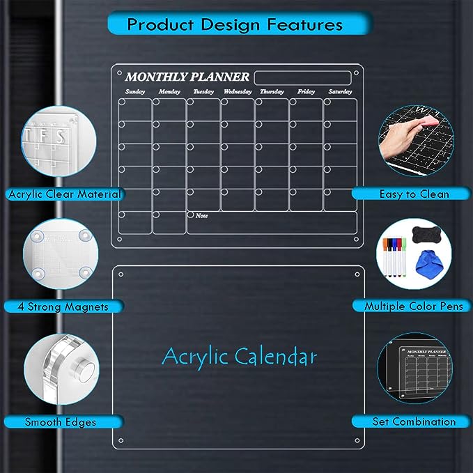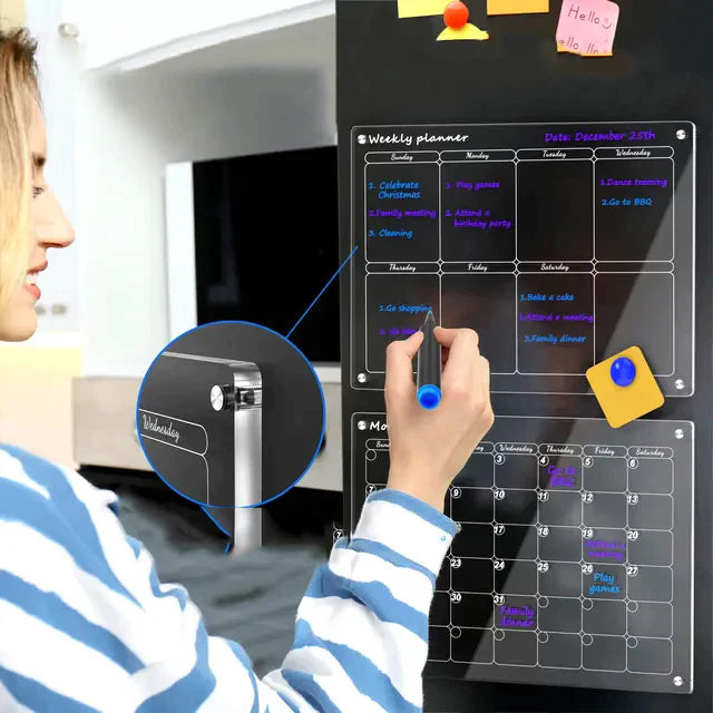Schließen Sie sich den Tausenden von glücklichen Hauseigentümern, Angestellten und Studenten an, die ihr tägliches Leben mit unserem magnetischen Kühlschrankkalender umgestaltet haben. Egal, ob Sie ein beschäftigter Elternteil sind, das Familienereignisse koordiniert, ein Berufstätiger mit einem vollen Terminkalender oder einfach jemand, der ein organisiertes Leben schätzt, unser Kalender unterstützt Sie dabei, mühelos den Überblick über Ihre Verpflichtungen, Termine und Pläne zu behalten.