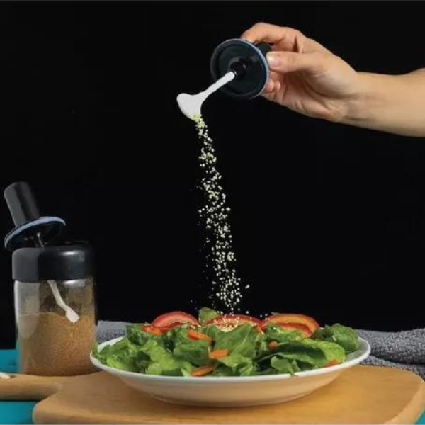 Die Behälter sind leicht zu reinigen und besitzen einen drehbaren Deckel mit 3 Einstellungen, der das Dosieren von Haferflocken bis zu feinen Salz- oder Oregano-Körnchen ermöglicht.