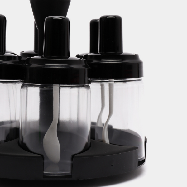 Beschreibung Gewürzorganisator x 6 Behälter, drehbare Basis und Gewürzlöffel x 6 Stück