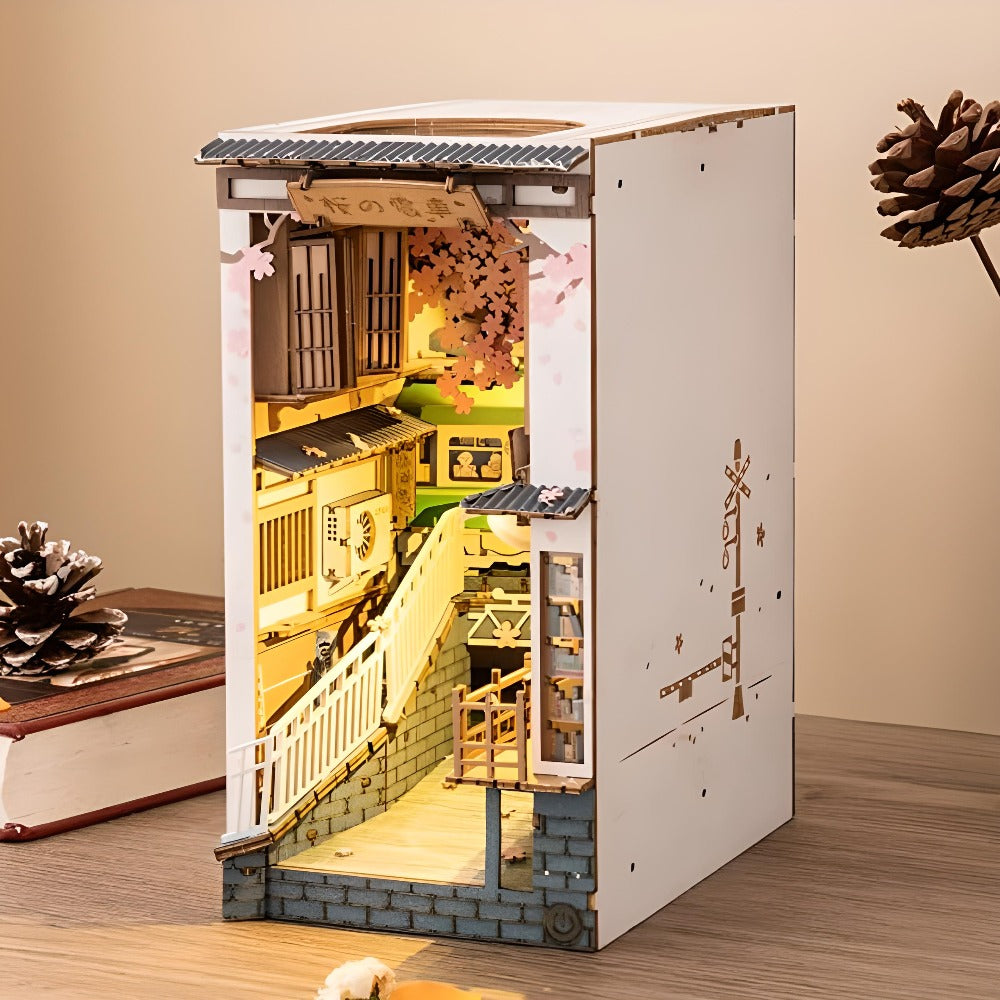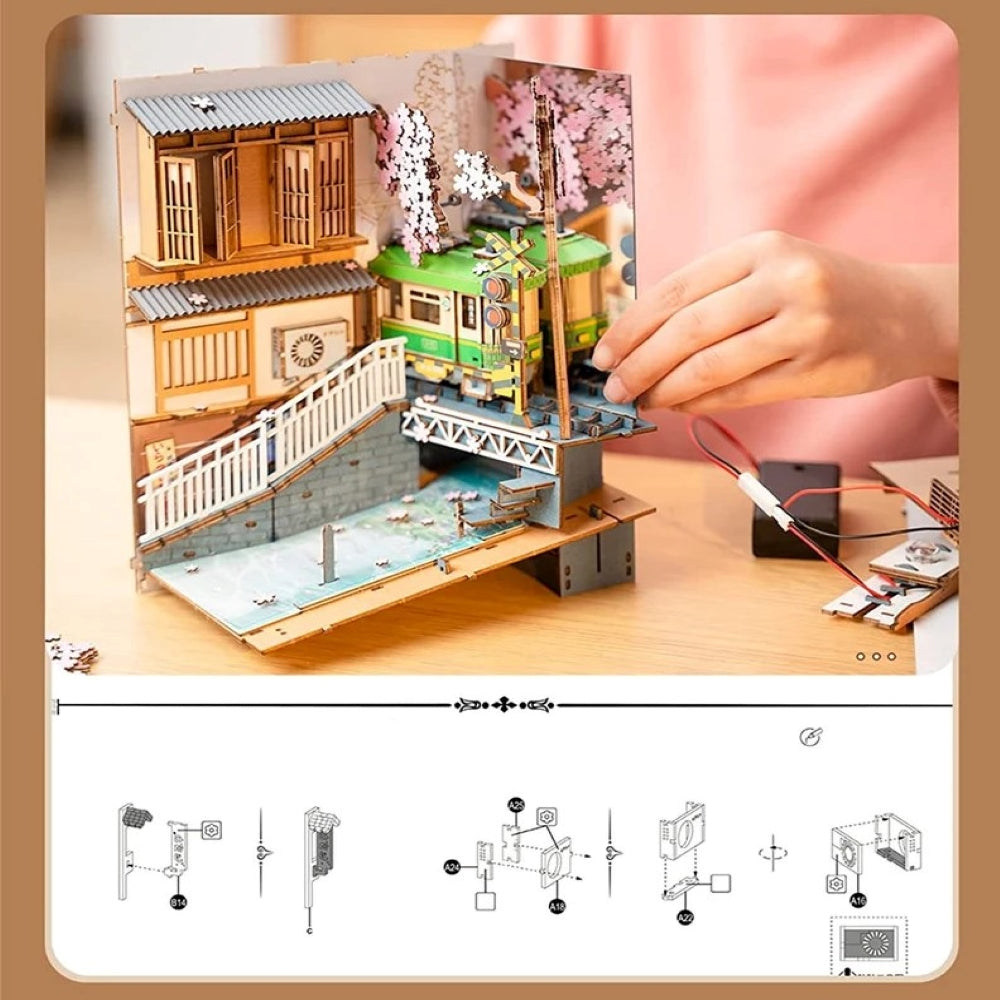 Dieser Deko-Bausatz von Sakura ist ein 3D-Holzhaus, das Sie eigenhändig zusammenstellen können. Wenn Sie dieses Kunstwerk vollendet haben, werden Sie von einer wunderschön gestalteten Frühlingsszene in den Straßen von Tokio begeistert sein. Dieses Miniaturhaus eignet sich hervorragend als dekorativer Akzent für Ihr Regal oder einen anderen Raum. Es wird Ihre Freunde und Familie beeindrucken, wenn es im Dunkeln leuchtet dank seiner LEDs. Darüber hinaus fördert es die Fantasie und Kreativität und ist somit ein ideales Geschenk für junge und erwachsene Buchliebhaber.