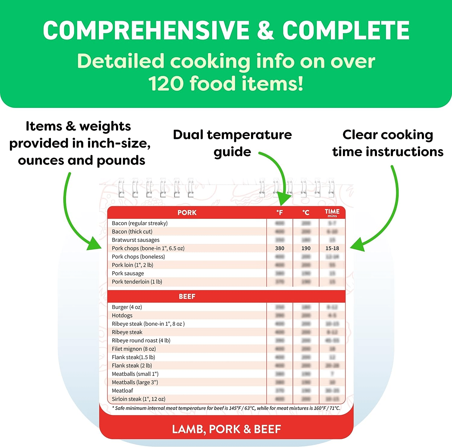 • Magnetische Zeit- und Temperaturtabelle für das Garen in der Fritteuse. Besondere Abschnitte beinhalten: Tipps & Tricks, Temperaturtabelle für Steak-Doneness bei Prime Ribs, sichere Mindest-Innentemperaturen für Fleisch, ein umfassender Abschnitt für Hülsenfrüchte und Gemüse für Veganer sowie eine spezielle Kategorie für Backwaren, Desserts und Snacks.