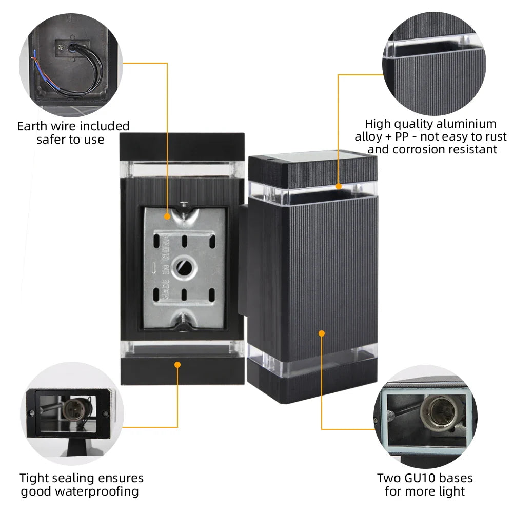 Verleihen Sie Ihren Außenbereichen zeitgemäße Eleganz und praktische Beleuchtung mit dieser Außenwandleuchte, die ein raffiniertes Up-and-Down-Lichtdesign präsentiert. Perfekt geeignet für die Ausleuchtung von Terrassen, Gartenmauern, Veranden sowie Eingängen, ist diese wetterfeste Leuchte mit 2 E27 LED-Glühbirnen ausgestattet und auf die Herausforderungen der Witterung ausgelegt. Ihre IP65-Zertifizierung für Wasserbeständigkeit und die flexible Spannungsanpassung (110V–220V) machen sie zur verlässlichen Wahl für sowohl private als auch gewerbliche Anwendungen im Freien.