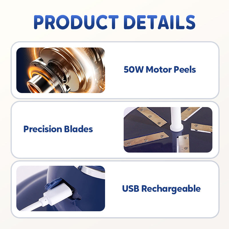Mit dem PeelMaster schälen Sie Obst und Gemüse in nur 25 Sekunden – ganz ohne Anstrengung oder Sauerei. Einfach den Knopf betätigen und der 50-Watt-Motor übernimmt die Aufgabe. Dank der intelligenten Kühltechnologie arbeitet das Gerät effizient und dabei extrem leise.