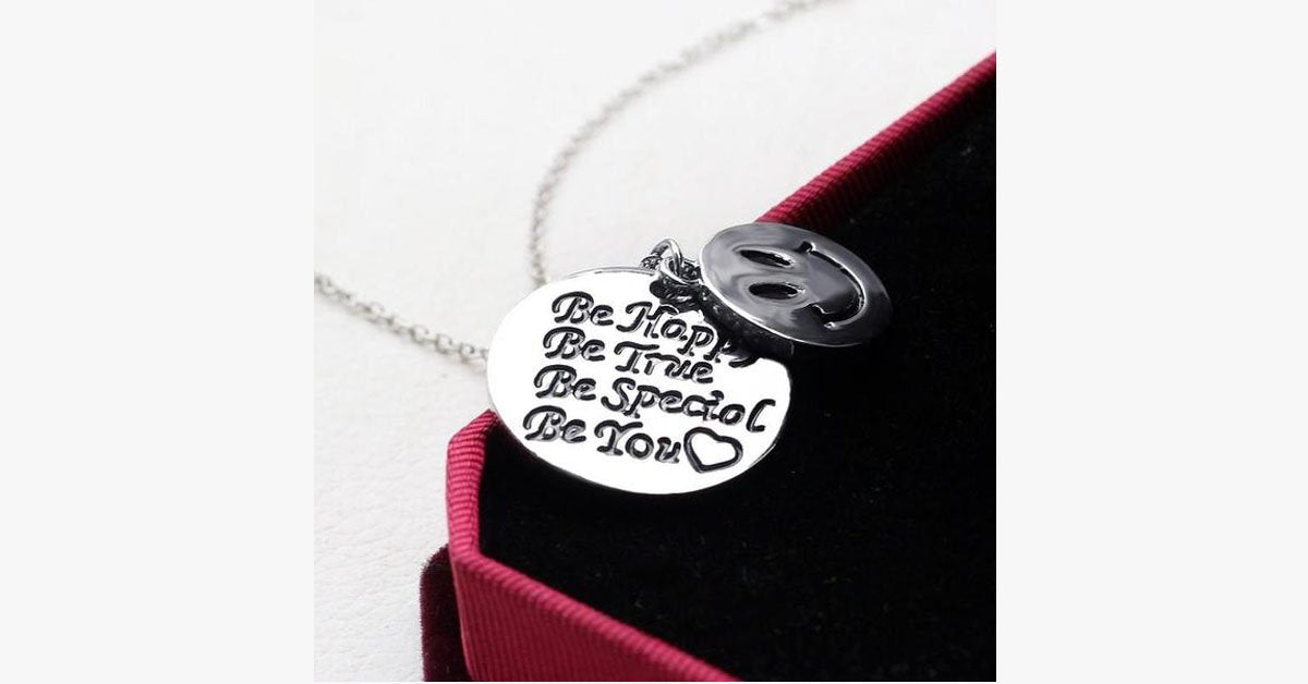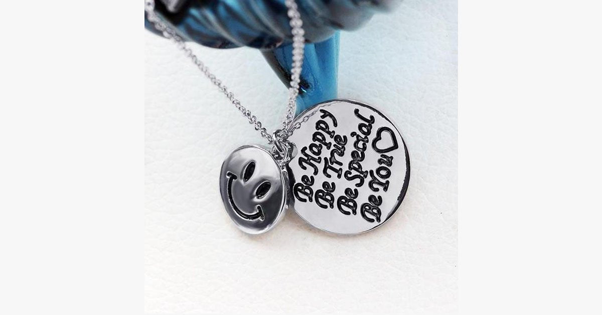 Dieses liebevoll handgestempelte Charm-Pendant dient als wertvolle Erinnerung, stets glücklich und loyal zu bleiben, egal welche Herausforderungen das Leben mit sich bringt.  Dieses stilvolle Schmuckstück umfasst zwei runde Anhänger: einer zeigt ein Smiley und der andere trägt den Spruch "Sei glücklich - Sei loyal - Sei einzigartig - Sei du selbst".  Es wäre ein wahrhaft inspirierendes Geschenk, das jede Frau gerne tragen würde.
