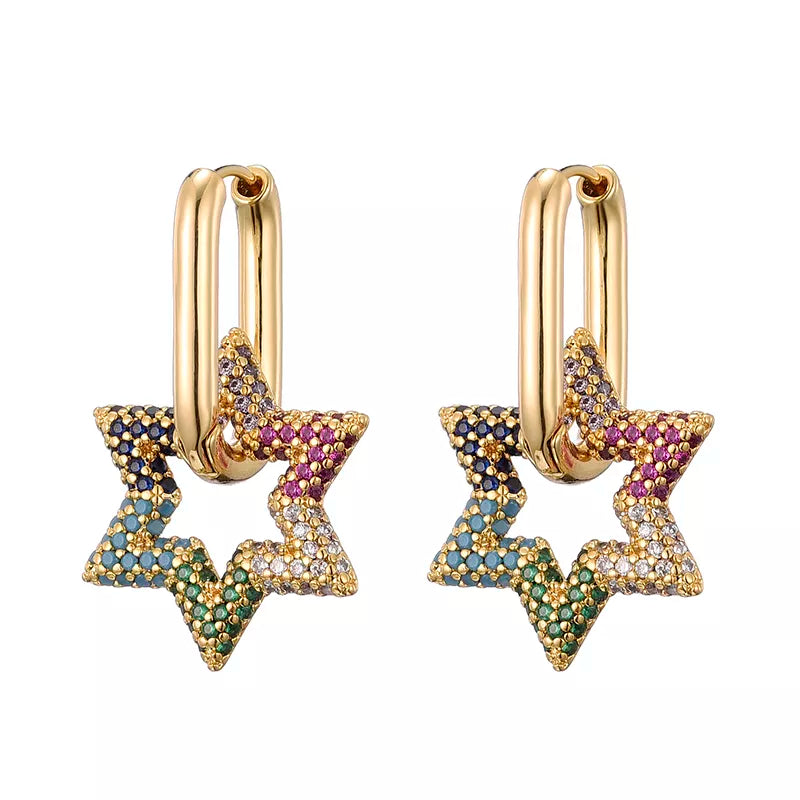 Luxuriös und stilvoll: Diese eleganten Ohrringe verfügen über zarte goldene Creolen, die mit schillernden, mit Zirkonen besetzten Sternanhängern verziert sind und eine perfekte Balance aus Raffinesse und Laune schaffen. Das vom Himmel inspirierte Design verleiht Ihrem Stil ein subtiles und trendiges Element.