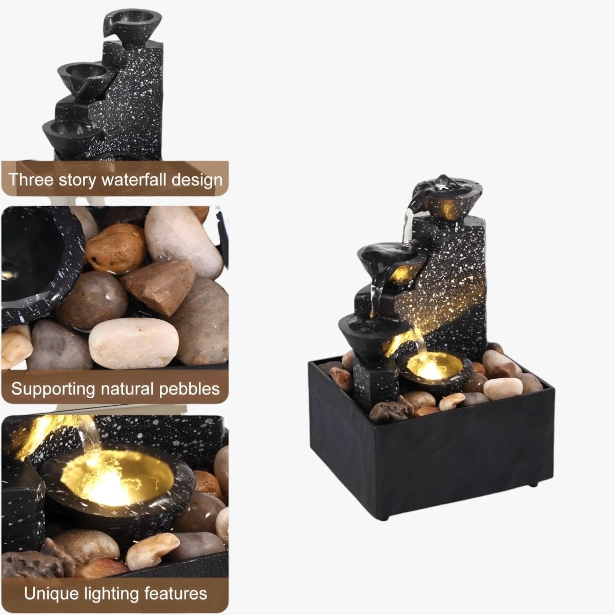 Der Wasserfallbrunnen verwandelt Ihr Zuhause oder Büro in eine Ruheoase. Mit seinem sanft strömenden Wasser und der behaglichen LED-Beleuchtung sorgt er für eine entspannende Atmosphäre, die ideal für Meditation, Konzentration oder einfach zum Relaxen nach einem langen Tag ist. Kompakt und stilvoll - dieser Brunnen ist der perfekte Begleiter für alle, die eine Auszeit vom hektischen Alltag suchen.